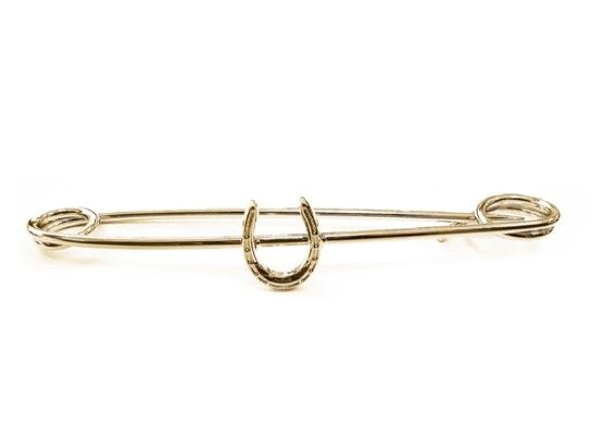 A strong, simple pin with detailed horseshoe that compliments any hunting, dressage, riding club outfit. Nickel free. 75mm length.