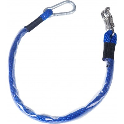 This polyester line is covered with transparent PVC to reduce wear and has a spring hook and panic hook.