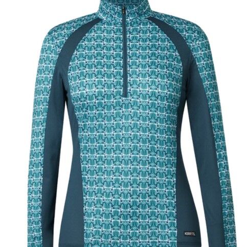 Stylish sun defence, this fun featherweight top is coverage riders will love wearing. Kerrits equestrian-inspired prints let riders express their style with UPF+30 protection and Ice FilĀ® technology that works as they sweat, lowering skin temp up to five degrees. The prints camouflage dirt and hide imperfections for cool, confident days in the sun. Ten-inch zip collar adds further ventilation while the sporty, feminine fit and equestrian hem flatter.